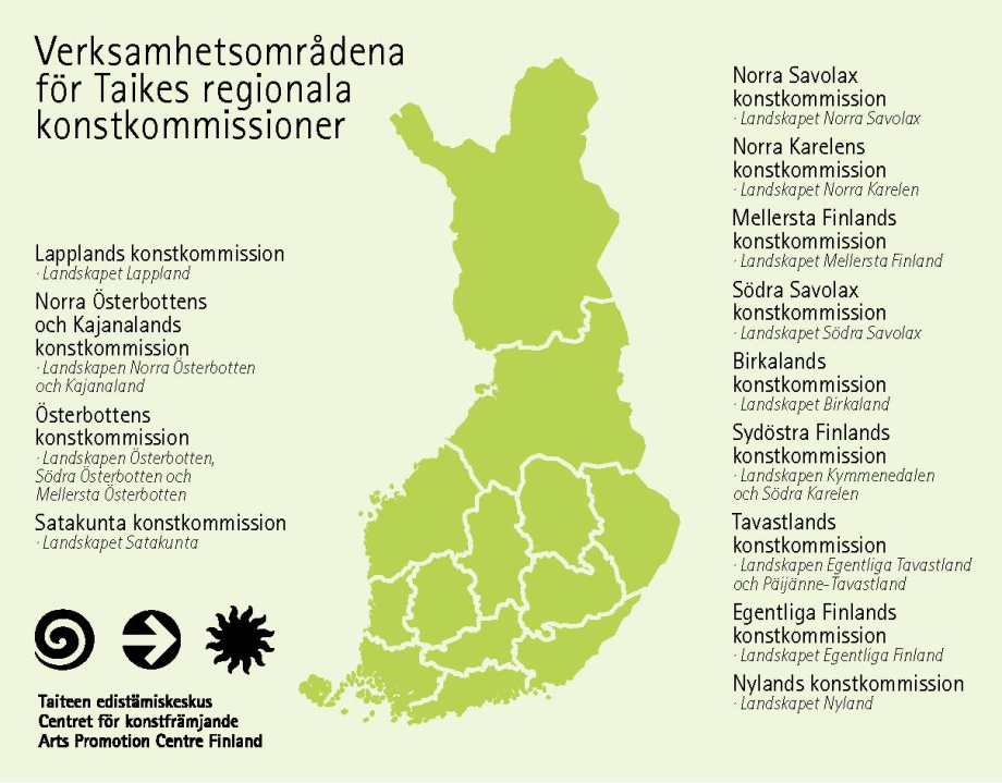 De regionala konstkommissionerna fattar beslut gällande stipendier och pris för sin egen regions konstnärer, konstnärsgrupper och samfund. De regionala konstkommissionerna beviljar även bidrag och stipendier för barnkultur och bidrag för främjande av kulturens inflytande på hälsa och välfärd.